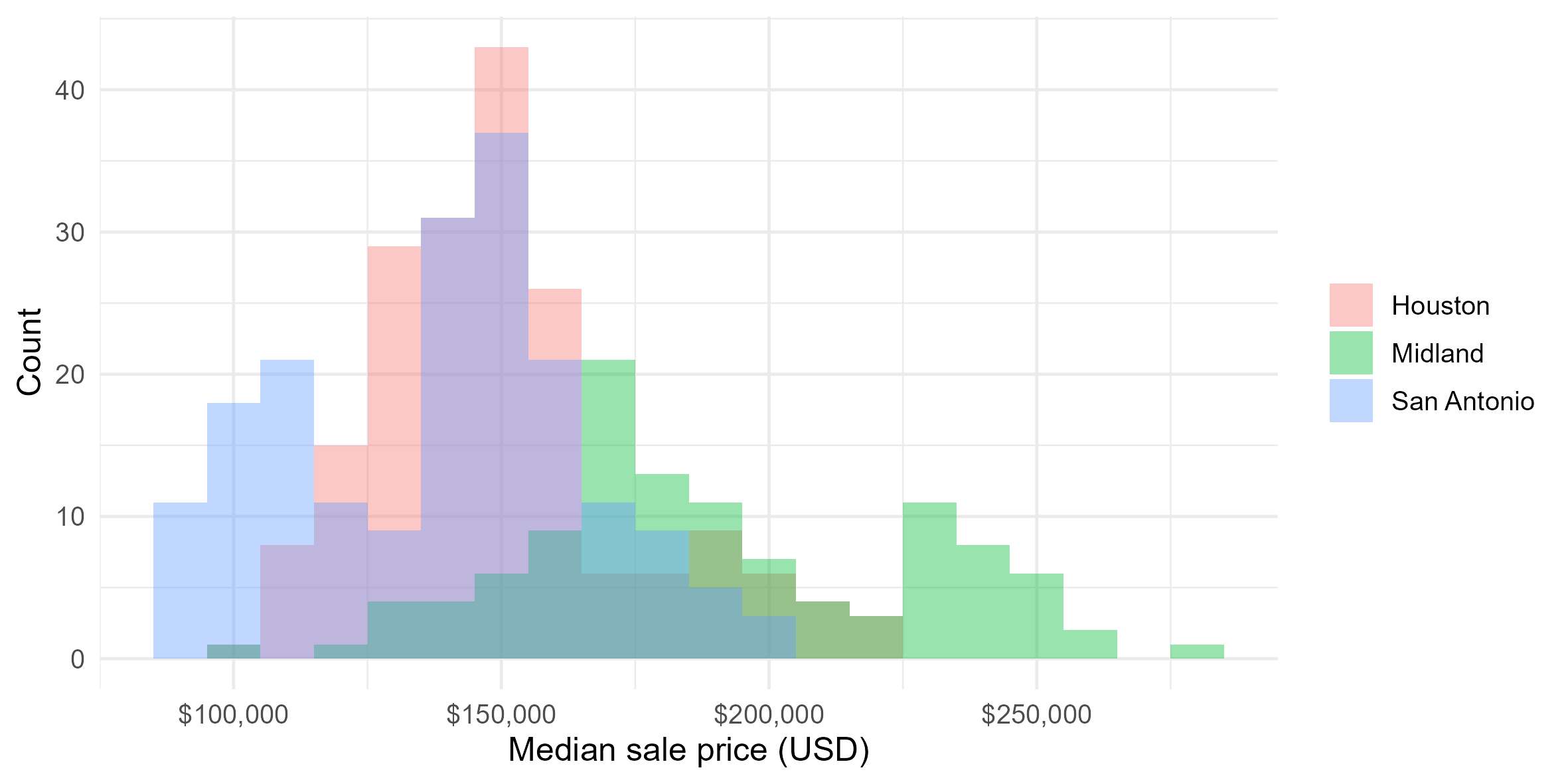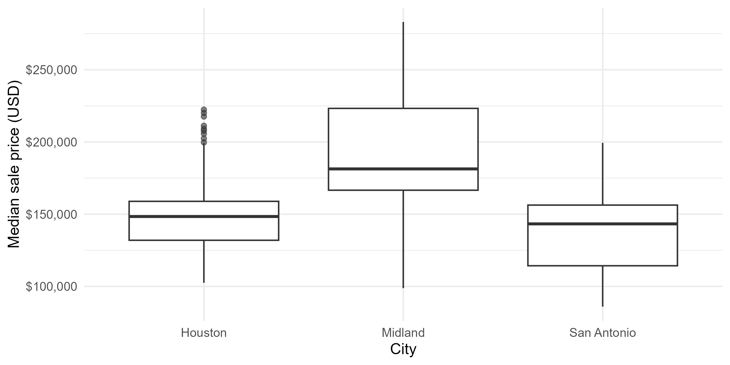 This project explores housing price dynamics across major Texas cities using comparative distribution analysis and visual segmentation. Using R and the Tidyverse ecosystem, I analyzed median sale prices across Houston, Midland, and San Antonio to identify structural differences in pricing levels, dispersion, and outlier behavior.